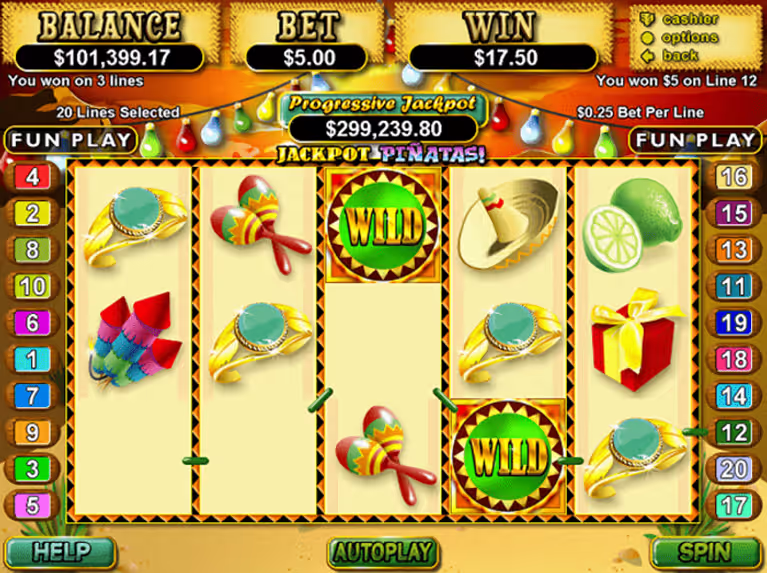 Jackpot Pinatas features 20 paylines across its 5 reels, giving you plenty of ways to win. The betting structure is straightforward – with a fixed coin size of $0.25 and one coin per line, you can wager up to $5 per spin by activating all paylines. This makes the game accessible to casual players while still offering enough action for more experienced slots fans.